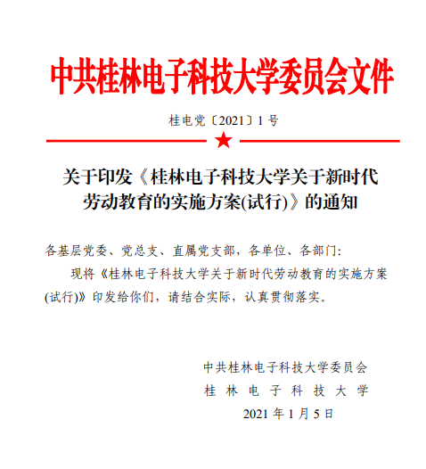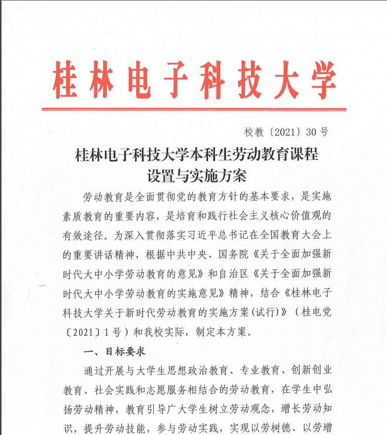 落实劳动教育保障制度。学校出台《开云(中国)关于新时代劳动教育的实施方案》(桂电党〔2021〕1号),坚持育人为本、突出价值引导、体现时代特征、强化综合实施,着力构建校院两级劳动教育体系。成立由学校党委书记和校长共同担任组长的劳动教育工作领导小组,成员包括教务处、校团委、学生工作部(处)、教学实践部、马克思主义学院、后勤处、宣传部、科学技术发展研究院、人事处、财务处等部门负责人,负责制定学校劳动教育的规划实施和落实监督,确保劳动教育落到实处,让学生在劳动中成长。