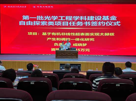 6月16日,光电工程学院在学校花江校区会议中心大礼堂举行第一批光学工程学科建设基金自由探索类项目任务书签约仪式,学院院长韩家广主持,共签署了9份任务书,资助额度共计234万元。第一批光学工程学科基金项目,学院共26人参与申报16项,其中40岁以下青年老师17人,占比65%;获得资助的项目参与人共19人,其中40岁以下青年老师13人,占比68%。