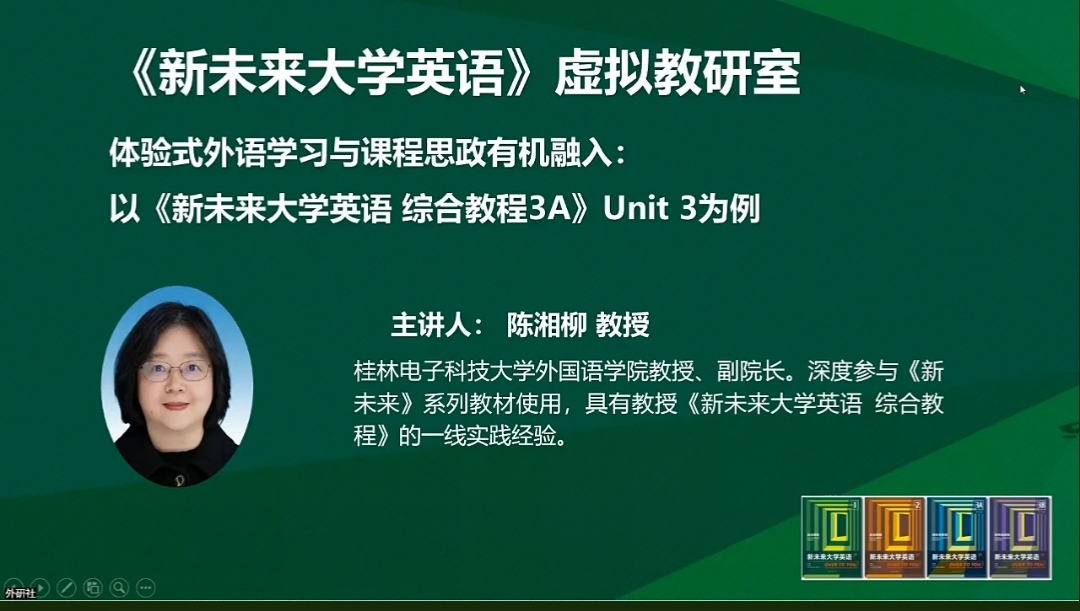 2023年11月2日,外语教学与研究出版社成功举办了题为“《新未来大学英语》虚拟教研室:聚焦教学设计,共享备课经验,共筑教学发展云共同体”的活动,旨在共同探讨、剖析教材重点环节,精准解决教师备课时的复杂难题。我院副院长陈湘柳教授做了“体验式外语学习与课程思政有机融入:以《新未来大学英语 综合教程3A》Unit 3为例”的主题发言。
