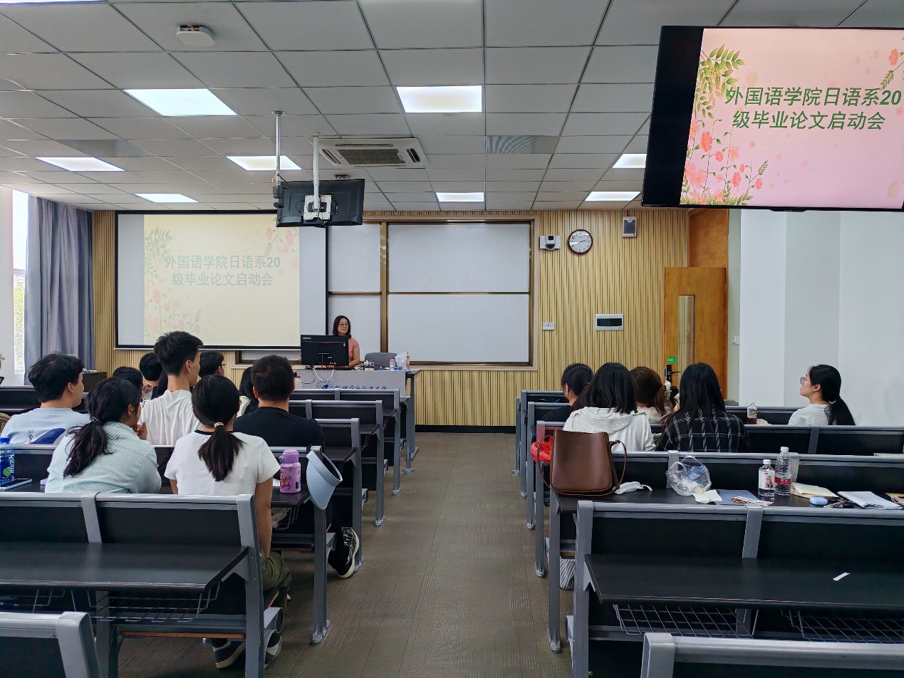 2023年10月9日,日语系在16教308教室召开了2020级本科生毕业论文启动会。日语系主任彭慧老师对本次本科论文工作的整体安排进行了详细介绍。从论文选题、导师分配、资料收集、开题报告撰写到论文初稿、修改、评审和最终答辩等各个环节,都做了明确的时间规划和要求讲解。特别指出,在选题方面,鼓励学生结合专业前沿、社会热点和实际应用需求,力求选题具有创新性和实践价值;同时,在导师分配上,秉持双向选择和专业匹配原则,确保每位学生都能得到专业教师的有效指导。