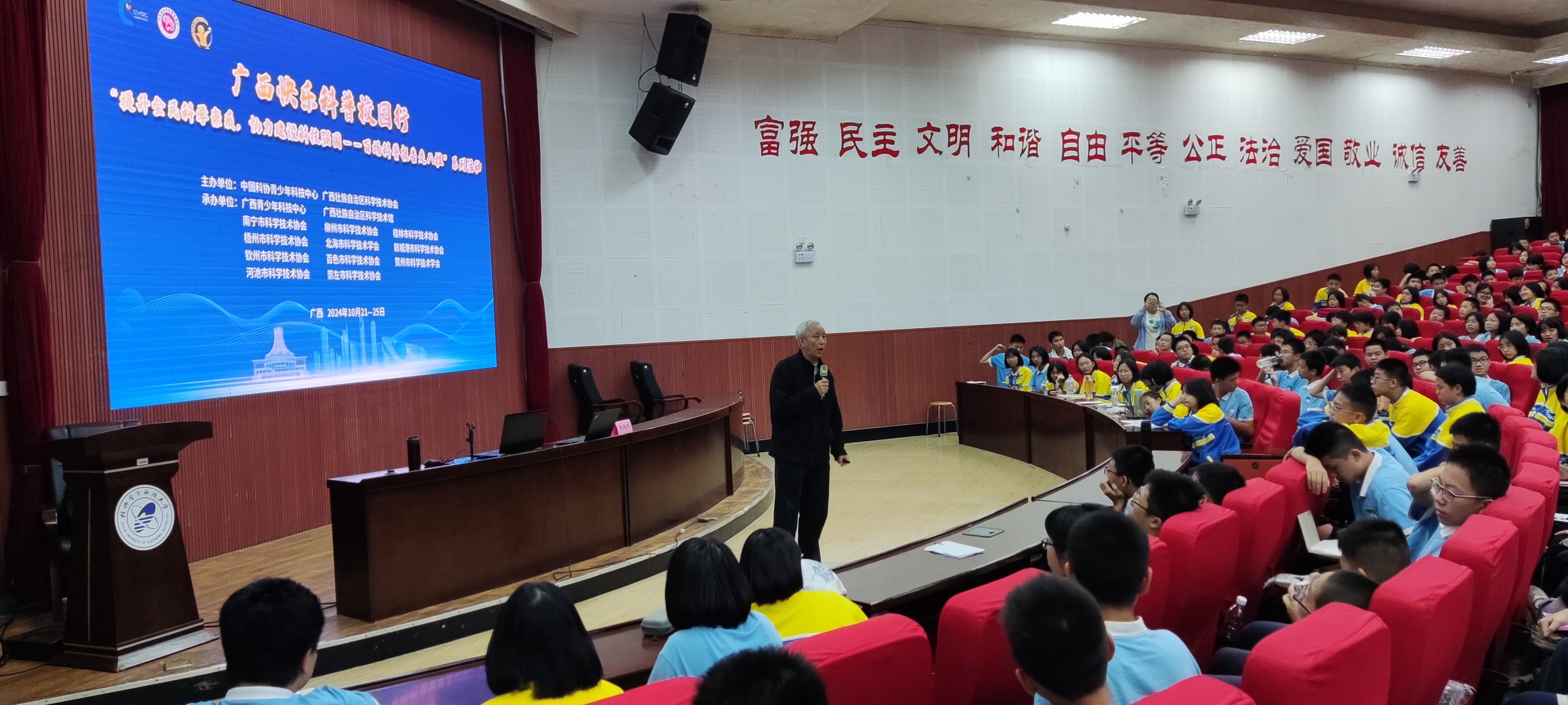 2024年10月24日,由中国科协青少年科技中心、广西壮族自治区科学技术协会主办、桂林市科学技术协会承办的“提升全民科学素质,协力建设科技强国——2024年大手拉小手科普报告汇广西巡讲活动暨广西快乐科普校园行活动”在在桂林市桂电中学、开云(中国)附属学校开展活动。中国科学院老科学家科普演讲团成员、北京大学焦维新教授为同学们做了一场主题为《北斗卫星导航系统》的科普讲座。