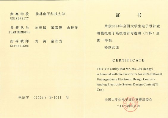 8月26日—30日,2024年全国大学生电子设计竞赛模拟电子系统专题赛(TI杯)决赛及颁奖典礼在杭州电子科技大学举行。由KY.COM刘涛、童有为老师指导的邹嘉赟、余梓洋、刘恒镒参赛队,赵中华、邓德迎老师指导的林国宏、吴金乐、阮磊参赛队双双获得全国一等奖,获得一等奖总数与杭州电子科技大学、南京邮电大学并列全国第一。这不仅是该项赛事举办以来KY.COM取得的最好成绩,同时也实现了该项赛事一等奖零的突破。