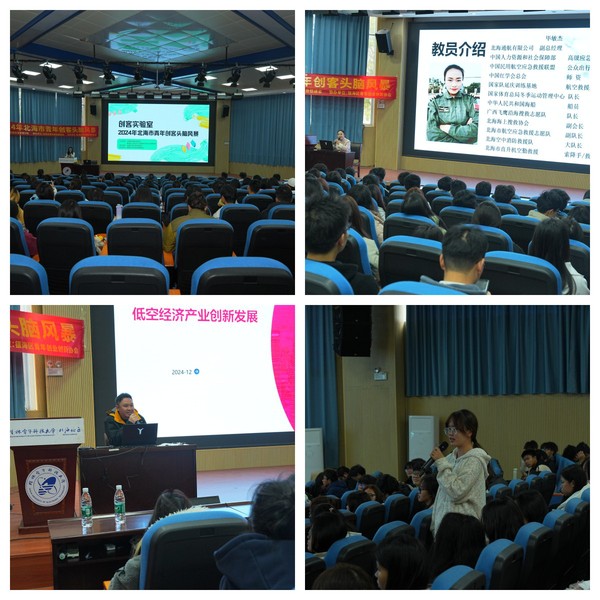 活动特邀北海科技创新创业服务中心主任姜青云、北海通航有限公司副总经理毕敏杰作为嘉宾,他们围绕低空物流经济、无人机技术应用等前沿话题,为学生们带来了精彩分享。互动环节中,同学们积极发言,就创业方向选择、就业市场趋势等问题向嘉宾进行了热烈提问。嘉宾们凭借深厚的行业经验,与同学们深入交流了青年创新创业面临的机遇与挑战,并着重强调了大学生职业规划的关键性,为学子们提供了极具价值的见解和实用指导。