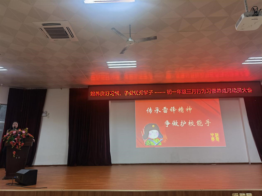 大会上,年级领导周荔主任做了以“培养良好习惯,争做优秀学子——传承雷锋精神,不负时代重托”为主题的重要讲话以及雷锋活动月的具体活动部署。首先,周主任别出心裁地用了五段非常精彩的视频分别来激励孩子们的爱国精神、自尊自爱精神、坚持坚强拼搏精神、团结奉献精神与热爱精神。紧接着,周主任强调:同学们应该从行为习惯、学习习惯、卫生习惯、礼仪习惯上严于律己,才能发扬雷锋精神。最后,周主任呼吁:作为新时代的桂电中学学子,应该要以热爱祖国、奉献祖国、强大祖国为己任,做一名合格的、优秀的社会主义接班人。