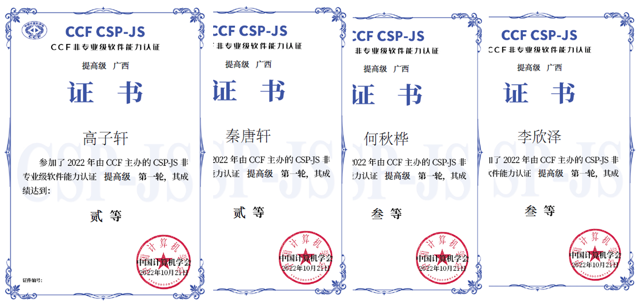 祝贺KY.COM学生在2022年CCF非专业软件能力认证第一轮比赛中获得优异成绩时间:[2022-11-04] 来源:政教处 点击数:115
