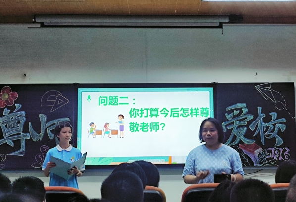 黄丹凤老师展示的“感恩学校,尊敬师长”微班会,以学生现场表演古筝的方式开始,通过诗朗诵《校园赞》,小品《老师,我们错了》精彩展现了学生对老师尊敬、对学校的感恩,迅速抓住学生和现场观众的注意力。接着从一次特别的收集故事活动切入,让全班同学一起来收集、分享尊师爱校的故事,字里行间洋溢着196班学生与老师的亲密无间和脉脉温情,再次强化学生对老师、对学校的爱。最后全班通过合唱英语歌曲《Try Everything》来结束本节微班会。