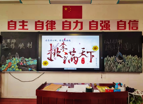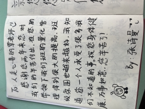 各班班干还利用课余时间精心准备本周“感恩润心田,携手铸班魂”主题班会。在班会上,孩子们给班主任带来各种意想不到的惊喜。有吉他弹唱的;有集体合唱的;有给班主任颁发专属手绘荣誉证书的;更有邀请班主任的家人进教室,给班主任带来温暖的亲情时刻的。同学们的创意和真情,让本届班主任节分外温馨。班主任和孩子们分享了甜蜜的蛋糕,整个教室洋溢着家的温暖。 ![]() ![]() ![]() ![]() ![]() ![]() ![]() ![]() ![]() ![]() ![]() 每一个班级的班干都代表全班给班主任写了深情款款的“班书”。