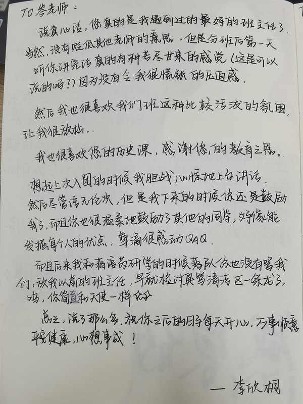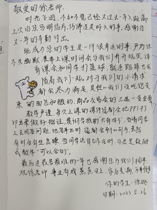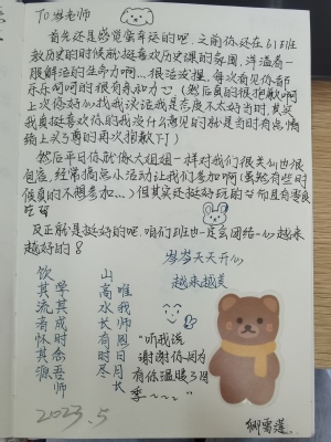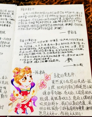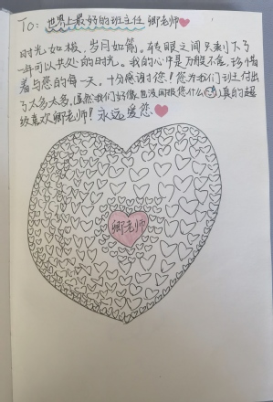班上的每一位同学还在班级留言本上,表达了对班主任的感谢。还有同学为班主任画了专属的肖像画,为全班画了全家福。