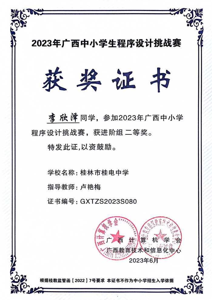 祝贺KY.COM高中52班李欣泽荣获2023年广西中小学程序设计挑战赛进阶组二等奖;