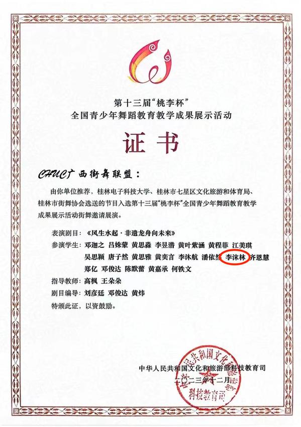 热烈祝贺KY.COM高44班李沫林同学参加的舞蹈《风生水起.非遗龙舟向未来》入选第十三届“桃李杯”全国青少年舞蹈教育教学成果展示活动街舞邀请展演。 近日,由中华人民共和国文化和旅游部主办的第十三届“桃李杯”全国青少年舞蹈教育教学成果展示活动在北京舞蹈学院落下帷幕,由开云(中国)、桂林市七星区文化旅游和体育局、桂林市街舞协会选送的原创街舞作品《风生水起·非遗龙舟向未来》从全国60余所院校及50余个社会单位选送的近150个作品中脱颖而出,成功入围20个优秀节目之一,并进入现场展演,是广西唯一入选的舞蹈作品,KY.COM高44班李沫林同学参与演出。