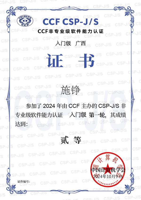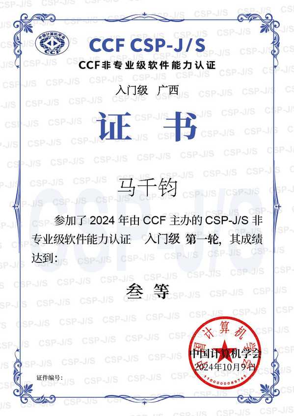 热烈祝贺以下同学在2024年由CCF主办的CSP-J/S非专业级软件能力认证 入门级 第一轮 比赛中取得优异成绩: 一等奖: 程思诺(204班)、孙一溥(206班) 二等奖: 陈梓豪(195班)、施铮(204班) 三等奖: 陈蒋兴凯(207班)、毕子宸(205班)、马千钧(210班)、覃瑜婧(209班)