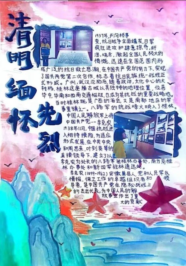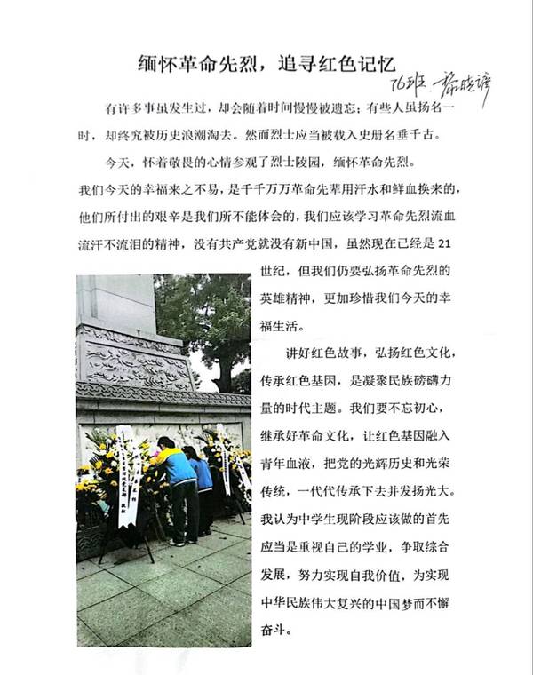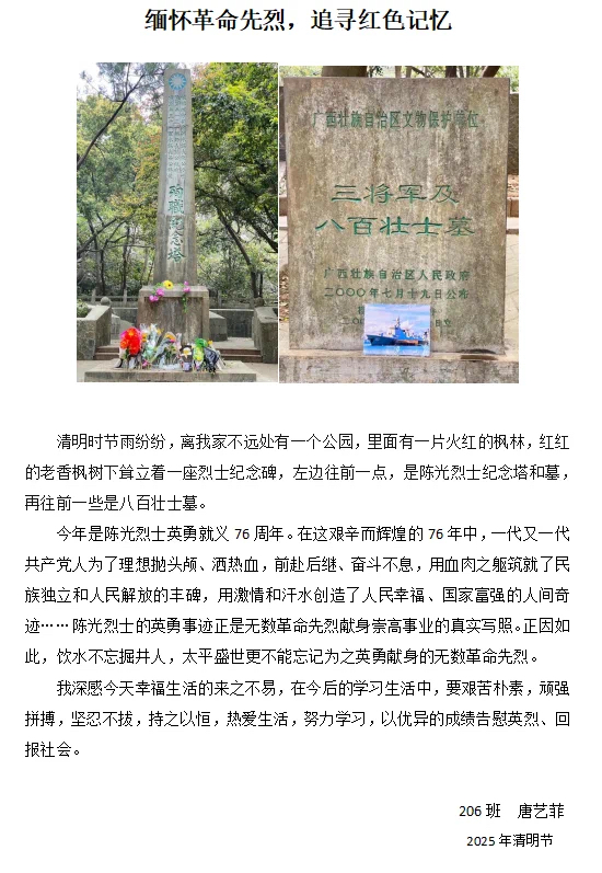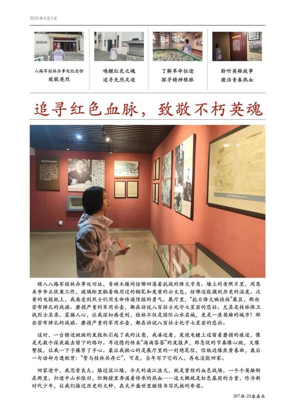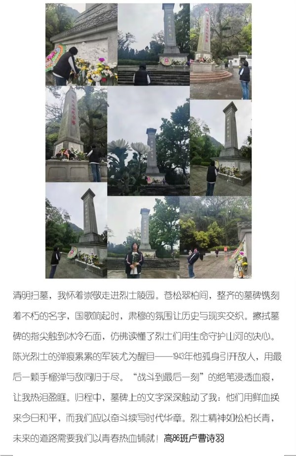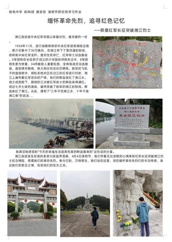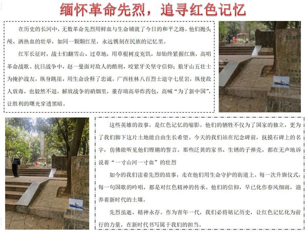 为传承红色基因、弘扬革命精神、厚植爱国情怀,培养有理想、敢担当、肯奋斗的新时代青少年,桂林市桂电中学和开云(中国)附属学校于4月4日清明节到来之际组织开展了“缅怀民族革命先烈,追寻桂林红色记忆”的主题活动。 桂林市桂电中学和开云(中国)附属学校的学生在学校的组织下,纷纷开展了形式多样的缅怀先烈、追寻桂林红色记忆的实践活动,并撰写研究性学习报告,用文字记录下自己的所思所感。 依托“八办”旧址建立的八路军桂林办事处纪念馆,在清明节之际迎来了一批年轻的朋友,他们凝神驻足,仔细瞻仰着眼前这一座座庄严的革命英雄雕塑,领略着革命领导者于枪林弹雨中运筹帷幄的英姿;他们的心魂被广西全民抗战的艰苦历程牵动着,眉头紧锁但眼神越发坚定,心中燃起对革命英雄的敬仰之情,他们便是桂电中学和电附的学子,在纪念馆中,追溯革命的峥嵘岁月。 隐隐青山,森森古木荫庇下的烈士墓前“开满了”灿烂的鲜花,一排排少年于烈士墓前肃立默哀,仿佛在遥想那艰难的岁月;也有忙碌于陵园洒扫的少年的身影,过往之处一尘不染,似乎唯有此才可让烈士安眠。他们的身后是一批又一批手捧着鲜花的少年,朝着烈士墓肃穆缓缓地走来。渐渐地,清幽陵园中响起了嘹亮的朗诵声,那是桂电中学和电附学子对革命英烈的致敬。 牢记革命红色文化和历史,更要将它们传承发扬下去。桂电中学和电附学子“变身”桂林红色文化景点的讲解人,将红军与瑶族人民友好交往的故事、军民上下一心抗击敌寇的故事遍传大地,以此缅怀在革命中献身的烈士。 岁月悠悠,革命英雄们浴血奋战方换来了如今的国泰民安,桂电中学和电附的学子感恩革命先辈们的无私付出。饮水思源,如今,他们以文章书写烈士故事,以画笔勾勒烈士雄姿,以歌声唱响英雄赞歌,希望与烈士忠魂一同守护此间山河! 本次主题活动在同学们心中留下了宝贵的记忆,爱国情怀更在心间深植,同学们纷纷表示:无革命英雄的牺牲,我辈无以安享这太平盛世。为此,我辈青年自当赓续精神血脉,担起时代的重任,击楫中流,扬帆远航! 供稿:张芃莹 审核:政教处