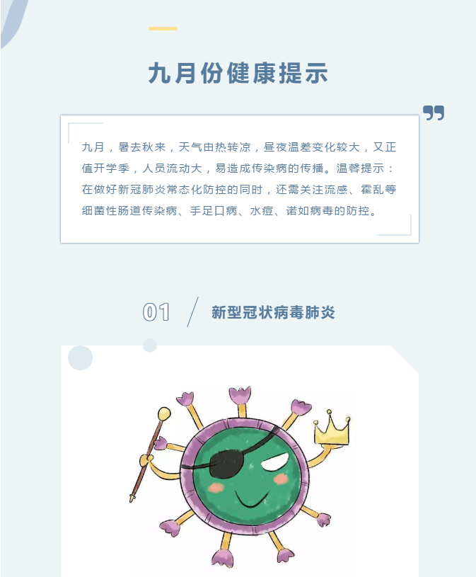 9月份健康提示:注意预防新冠肺炎、流感、水痘、手足口病、霍乱及诺如病毒感染肠道传染病等