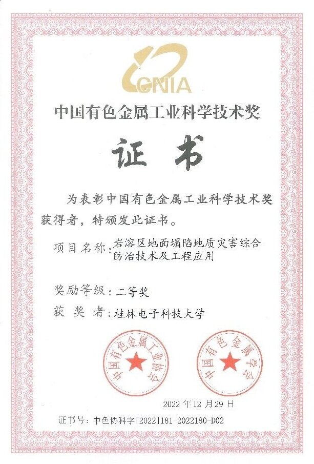 近日,中国有色金属工业协会、中国有色金属学会公布了《关于颁发2022年度中国有色金属工业科学技术奖的通知》。其中,我院程峰教授(排名第一)课题组的“岩溶区地面塌陷地质灾害综合防治技术及工程应用”荣获科技进步二等奖。