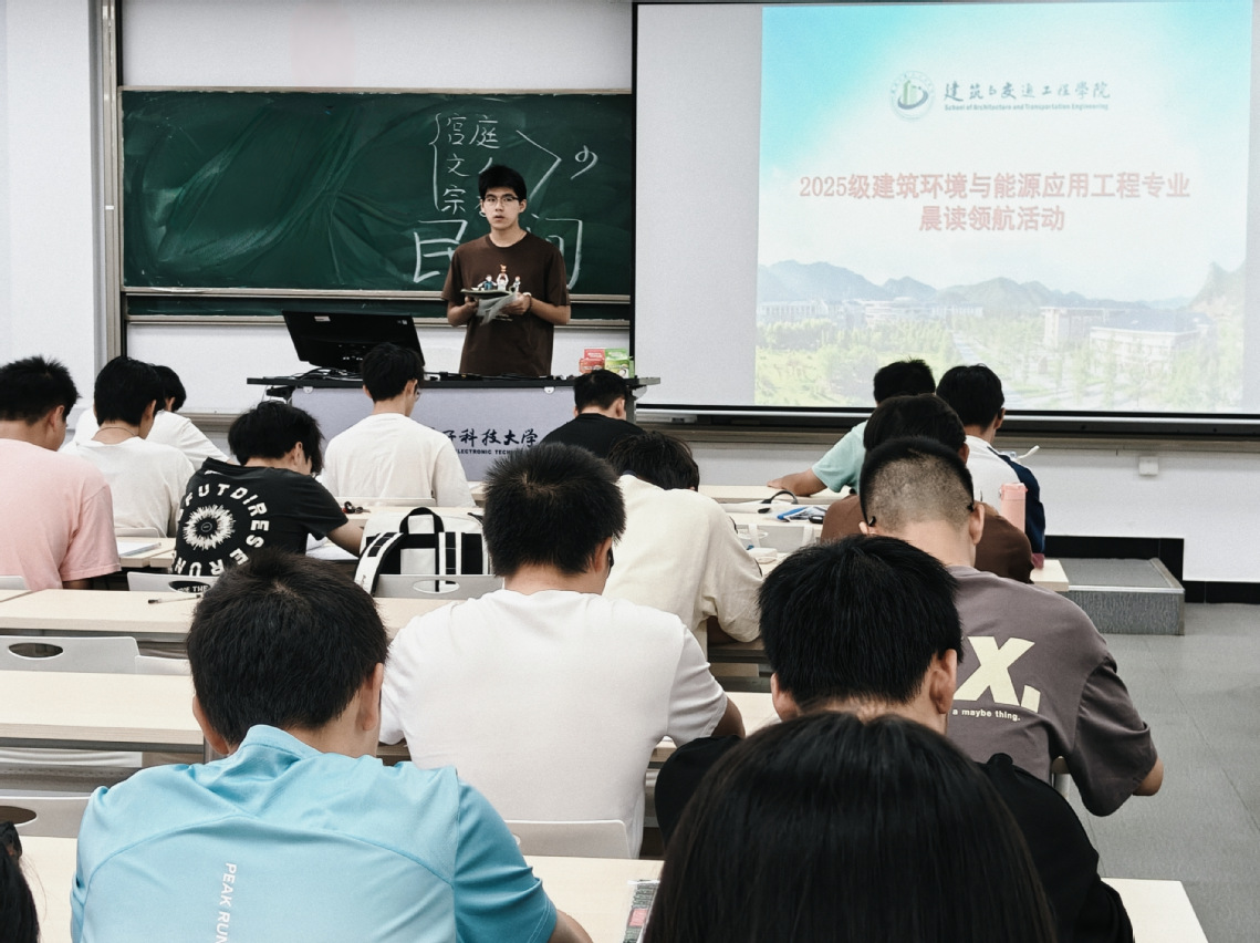 9月22日至30日,2025级建筑环境与能源应用工程专业在花江校区第十七栋教学楼412室开展“晨读领航”学习活动。2023级朱劭恒同学用流利的英语带领着同学们开始一天的学习,除了集体领读,朱劭恒同学还会在晨读时间里传授学习方法,分享四六级备考经验和高效背单词的方法,充分发挥了“晨读领航”的“传、帮、带”作用。