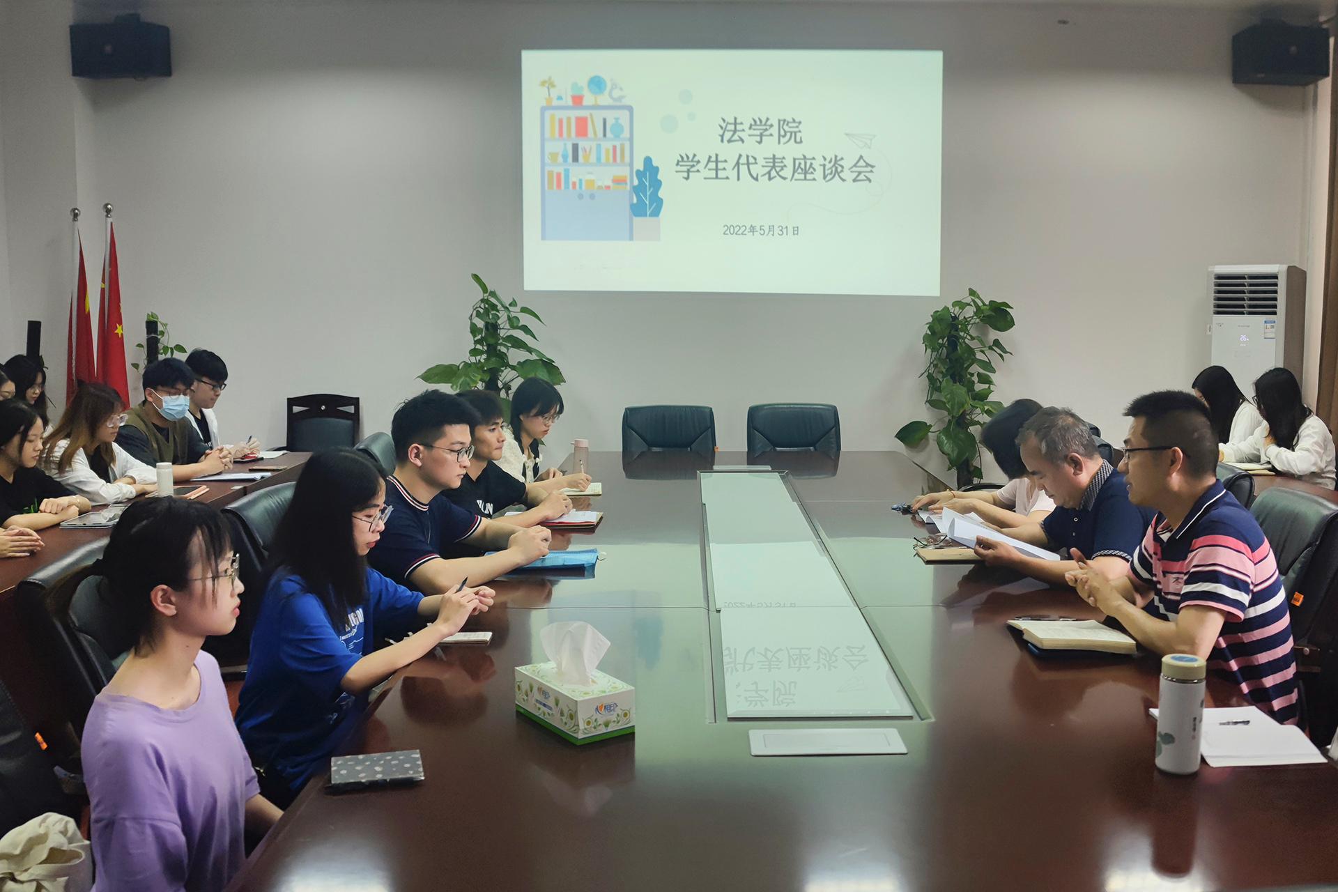 5月31日,法学院在花江校区一教316会议室召开学生代表座谈会,认真听取学生对于学院教育教学、工作管理等方面的意见和建议。参加本次座谈会的有法学院党委书记蒋小斌,院长高兰英,党委副书记程飞,副院长赵玉意,各年级辅导员,以及来自各年级的14名本科生代表和2名硕士研究生代表。