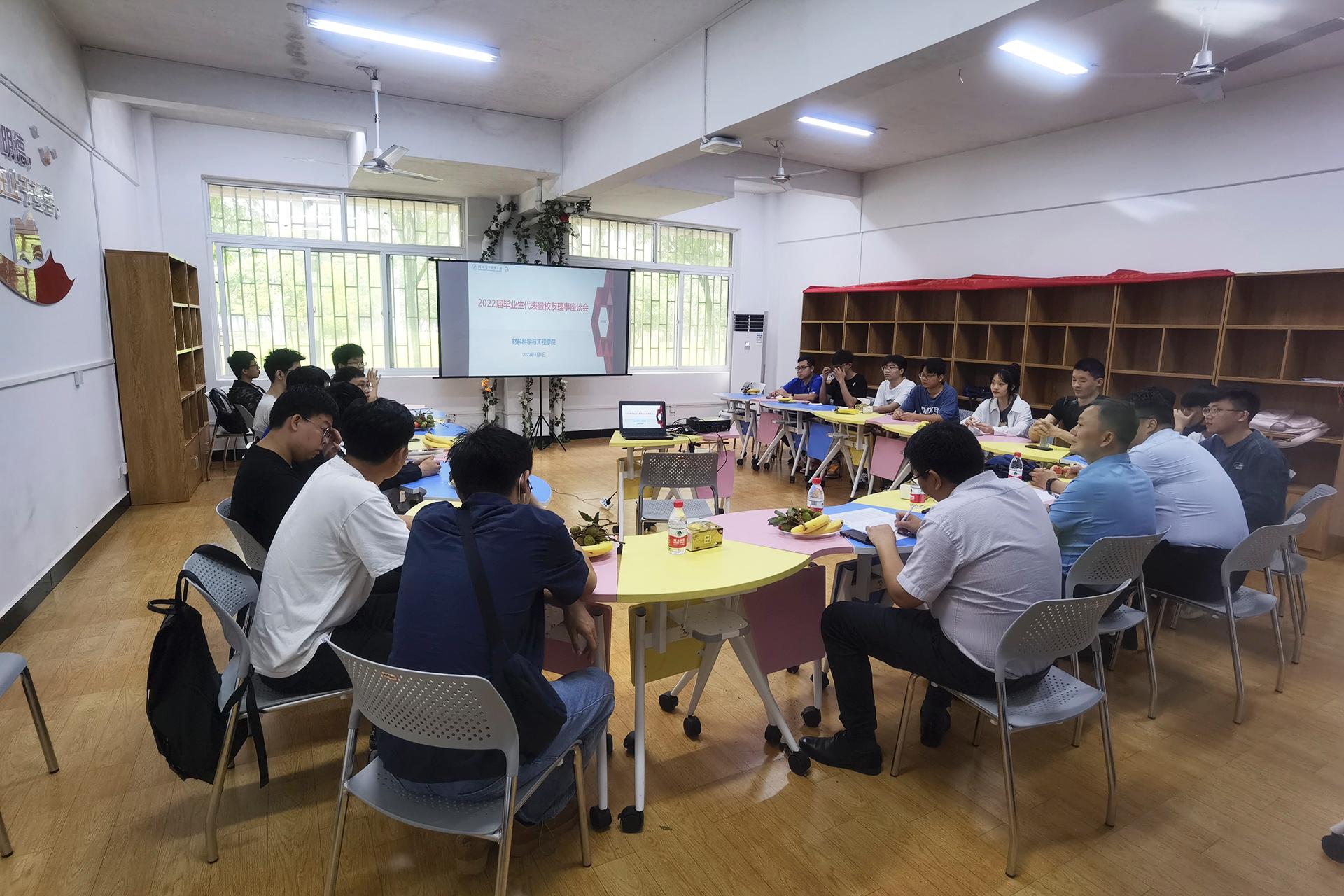 近日,材料科学与工程学院召开2022届毕业生代表暨校友理事座谈会,学院党委书记黄少波、院长张坚、副书记展领、毕业班辅导员、2022届毕业生代表及校友理事参加座谈会。